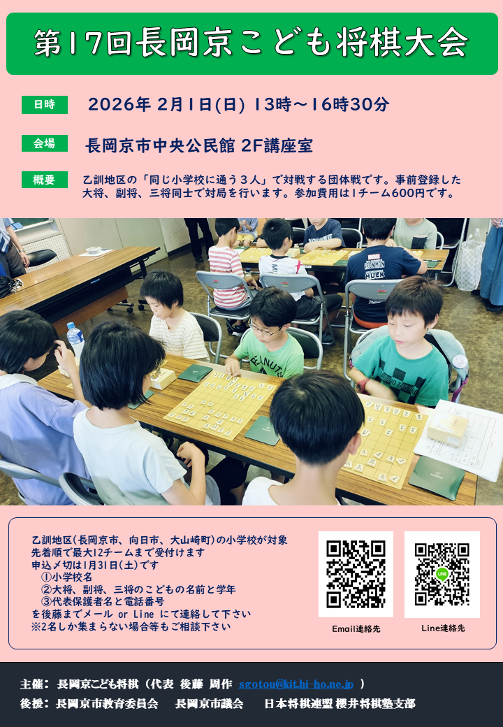 2026/2/1(日)に長岡京中央公民館にて、第17回大会を開催しました。今回、長岡京教育委員会、長岡京市議会の後援も頂き、市内の全小学校の全生徒にチラシを配布して頂きました。今回の参加チーム数は市内の6つ小学校から12チームの申し込みがあり大会参加者は34名。初めて参加頂いた方も8名ほどいました。